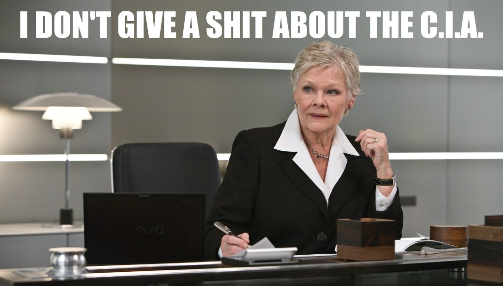 Besides being a milestone Bond film for critical acclaim, financial success and for marking fifty years since the release of Dr No, Skyfall also features the series’ first explicit uttering of the word “fuck”. It is, of course, Judi Dench who has the line—we’ve already established that her M is not averse to the occasional creative pejorative, for example when she declares in Casino Royale “Christ, I miss the Cold War” or in Quantum of Solace “I don’t give a shit about the CIA”.