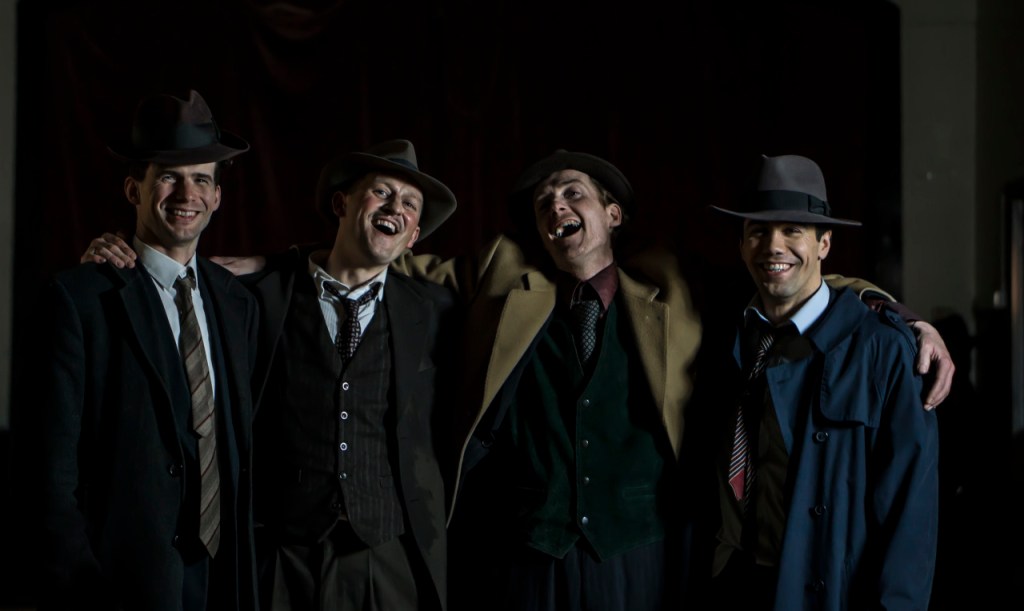 We drop the morning scene. Instead we record voiceovers with Karl and Nima Séne, who plays femme fatale Brigid Astor. For clean sound we wrap ourselves in a thick stage curtain at SYT.