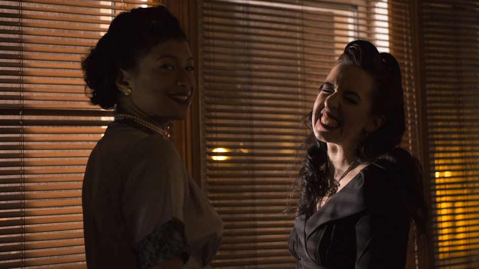 Location move. Swing, a themed nightclub in the city centre, becomes our 1940s wine bar. We cobble together seven extras. We need a couple more. Daiva and I step up. We shoot the master. It feels strange walking through the scene instead of watching from the perimeter.