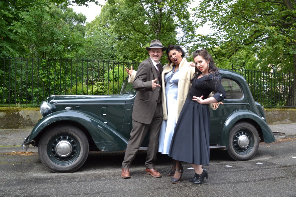 Daiva and her team go to city centre hotspot The Griffin to prep the next scene. Queen’s Crescent becomes a make-up, hair and wardrobe production line. Karl, Tim, Miranda Langley, Joe McKenna and Colin Cunninghame are the afternoon’s leads. Ten extras for background. Nima and Naomi are wrapped for the day, but stick around to help out. Tom Bearne takes everybody outside for some publicity stills with the Austin.