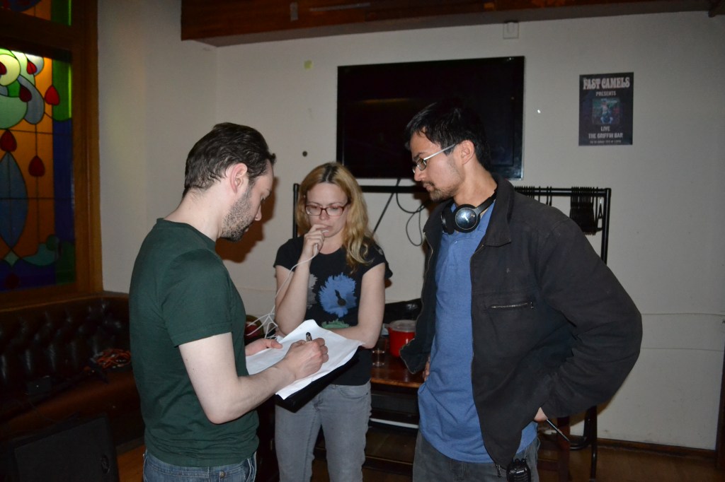 Back to Film City Glasgow. We shot in the men’s room in May. Today we’re in the ballroom for the film’s parting shot – Nima steps up to a microphone and sings over the credits.
